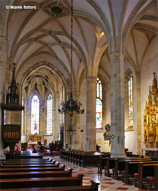 ARCHITEKTURA. Ten gotycki kościół złożony jest z bazylikowego korpusu o trzech nawach i pięciu przęsłach oraz z prezbiterium o czterech przęsłach, zamkniętego pięciobocznie. Przy korpusie od zachodu stoi wieża wysoka na 85 m., nakryta pseudobarokowym hełmem z latarnią, który zwieńczony jest kopią korony św. Stefana, upamiętniającą 19 koronacji królów węgierskich które odbyły się w tej świątyni w latach 1563-1830. Przy północnym narożniku, pomiędzy nawą a prezbiterium, stoi barokowa kaplica św. Jana Jałmużnika, nakryta kopułą z latarnią. Korpus nawowy i prezbiterium nakryte zostały sklepieniami sieciowymi. Na zewnątrz kościół opięty jest przyporami, między którymi umieszczone zostały ostrołukowe okna ozdobione maswerkami. Kościół nakryty jest dachem dwuspadowym. Interesujący jest gotycki portal północny z XV w. ozdobiony płaskorzeźbą Trójcy Świętej.